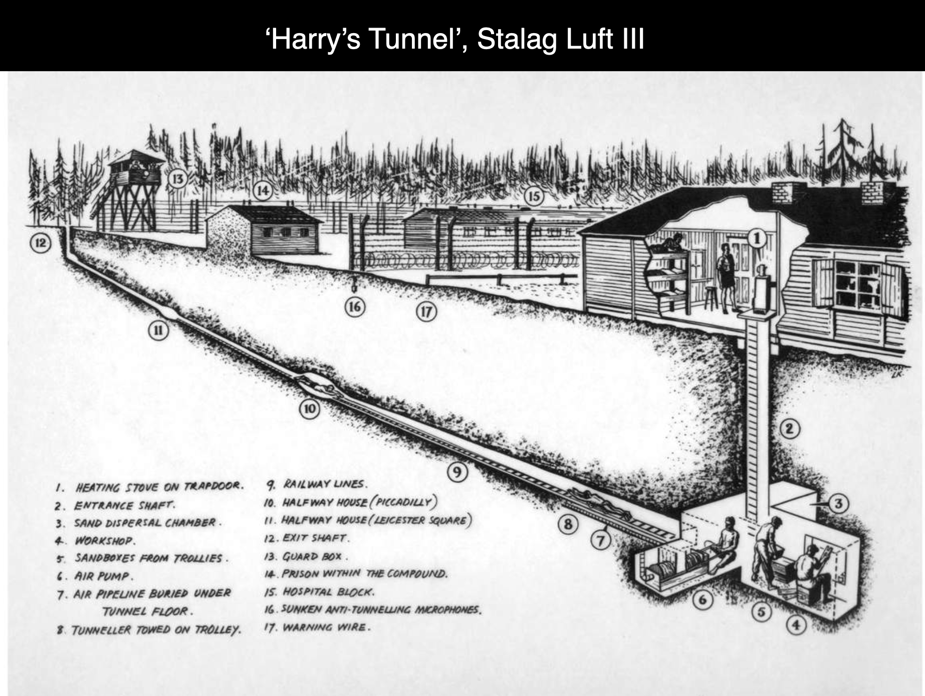 By bribing guards, the prisoners managed to forge identity cards. Two hundred men were selected to escape, most through a lottery system. However, the ‘Tom’ tunnel was discovered before completion, and ‘Dick’ was repurposed for storage. ‘Harry’ was finally completed in early 1944.